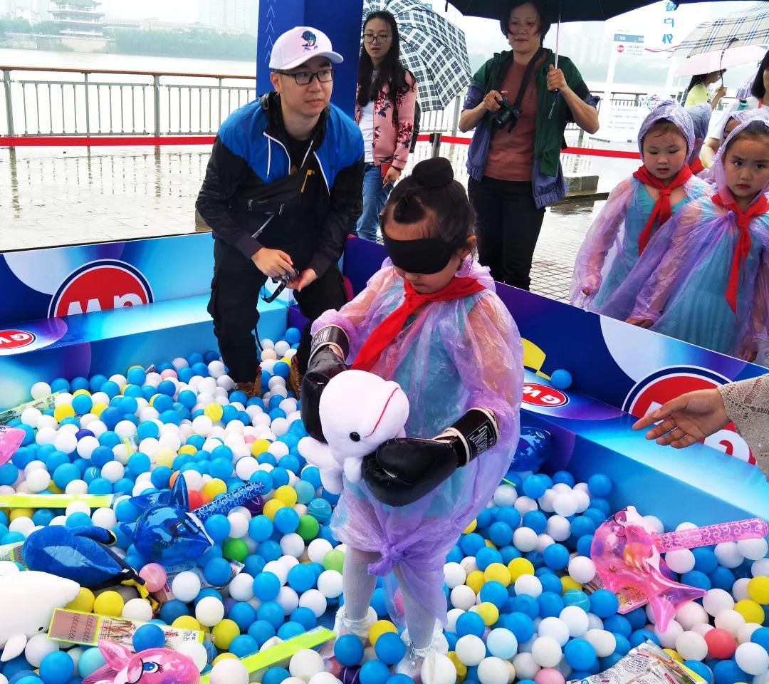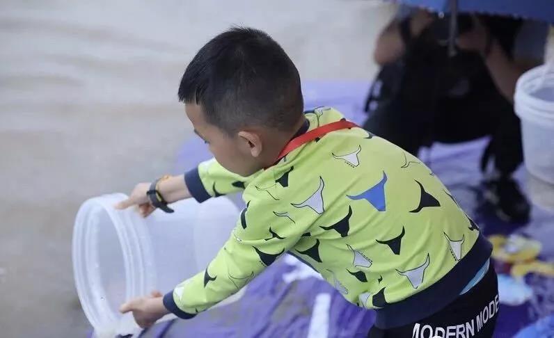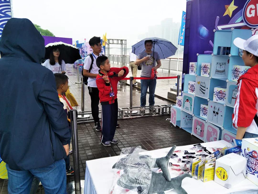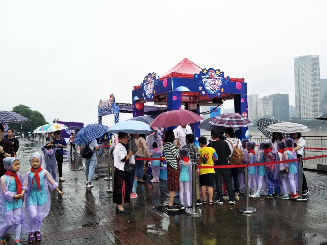 爸爸媽媽和小朋友們穿著雨衣、打著傘,不懼大雨滂沱,眼里只有歡喜和期待。甚至有人在項(xiàng)目前早早的排起了長(zhǎng)隊(duì),只為一馬當(dāng)先,占得先機(jī)。